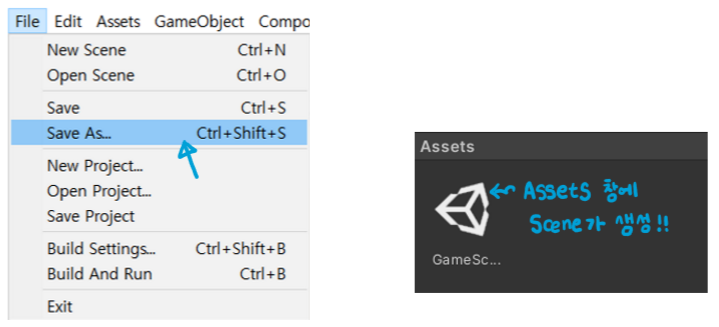 상단 메뉴의 File -> Save As를 눌러 씬을 저장해준다. (씬의 이름은 원하는 대로!)