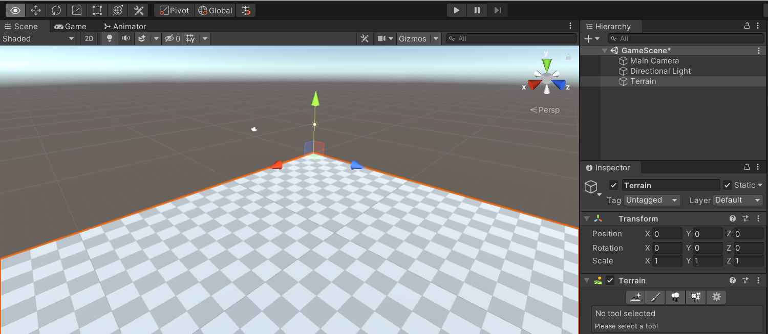 좌표축 표시를 위해 이동도구 선택 -> Terrain선택 -> center가 아닌 Pivot으로 변경한다.