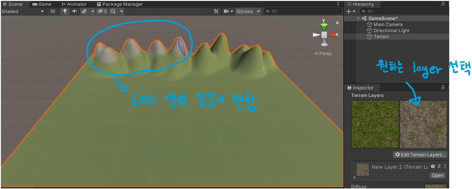 Terrain Layer을 하나 더 만들어 원하는 질감을 선택한 후 Terrain오브젝트를 드래그하면 해당 부분 질감이 변한다.
