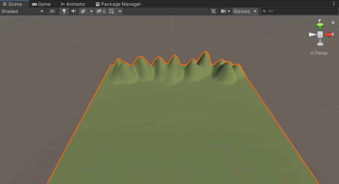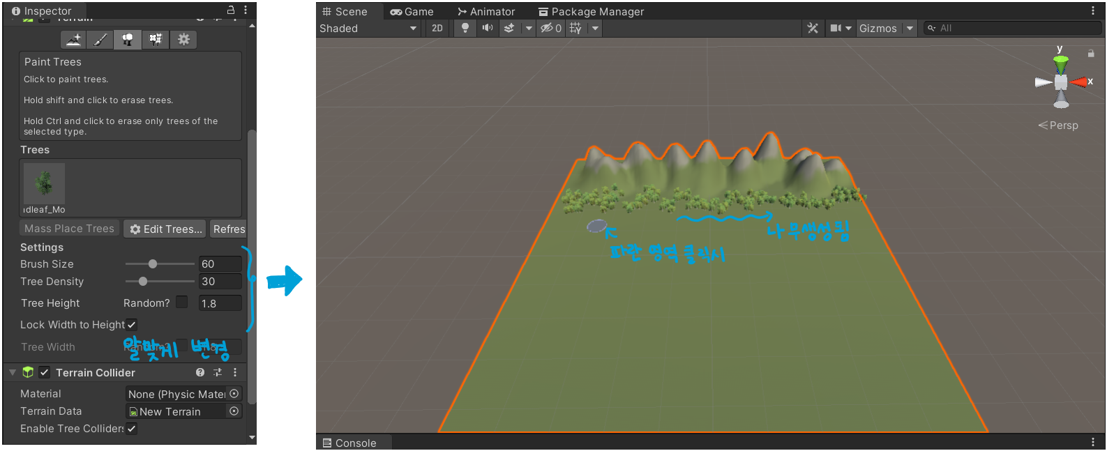 이때, 파란 동그라미가 생기는데 Terrain위를 드래그 하면 해당 부분이 올라간다.