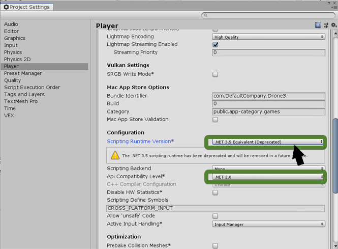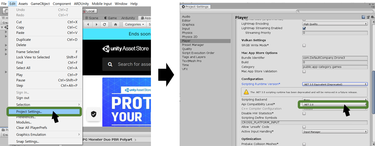 (*이때, projectsettings -> player -> configuration도 .NET 3.5로 수정해 주어야 한다.)